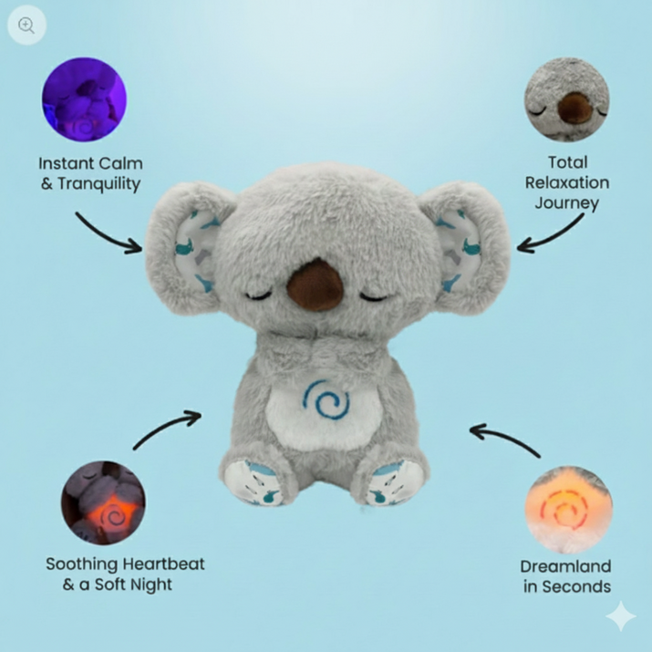 SleepyKoala™ uses a soft, rhythmic motion combined with a calming heartbeat sound. Together, they mimic real breathing patterns to naturally relax the body and mind — making it easier to fall asleep.